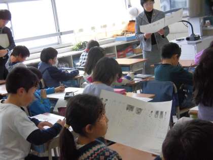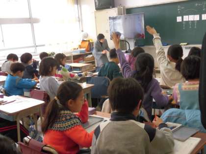 3年生の国語の授業の様子です。この日は「身ぶりのはたらき」とういう説明文の学習でした。今日の授業では、文章を1枚のシートで読み取ることができる工夫がされていて、子供たちも文章を前後で比較しながら読み進めていました。たくさん意見を言ったり、文章を何度も読んで考えたり、子供たちの活躍がたくさんの場でみられました。