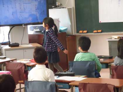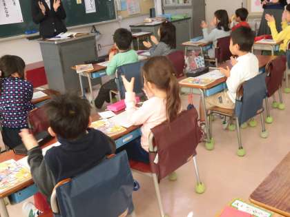 1年生の国語の授業の様子です。今日は、自分で考えたお話を文章に書く練習をしていました。子供たちの豊かな発想で楽しいお話づくりができました。友達の意見や考えに拍手をおくって称賛するなど、授業を通して互いを認め合う姿が見られました。また、テレビモニターに子供たちのノートやワークシートを映し出し、発表時に活用していました。
