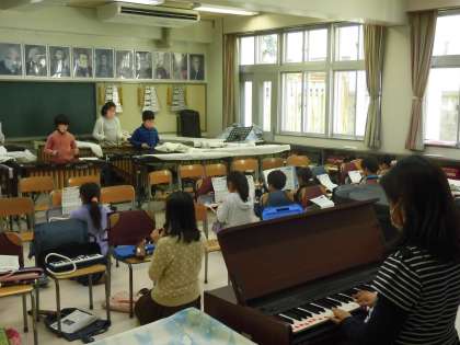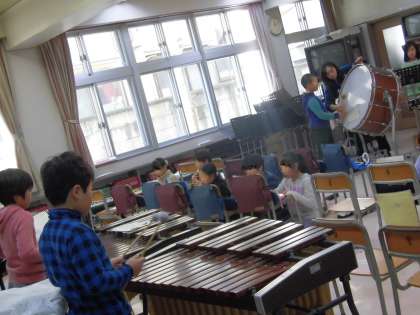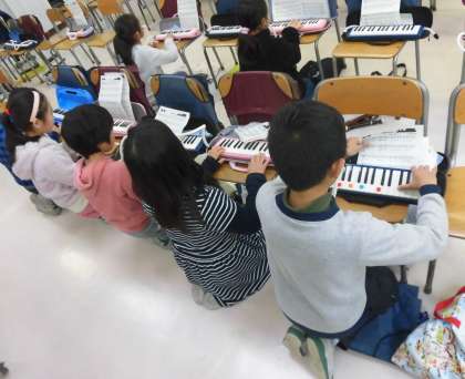 4年生の音楽の様子です。子供たちは様々な楽器を分担して、「茶色の小びん」の合奏を行っていました。A・Bの2つのグループに分かれて、楽器を交換しながら、協力して一つの音楽を創り上げました。思わず体でリズムをとってしまうほど、息の合った演奏です。