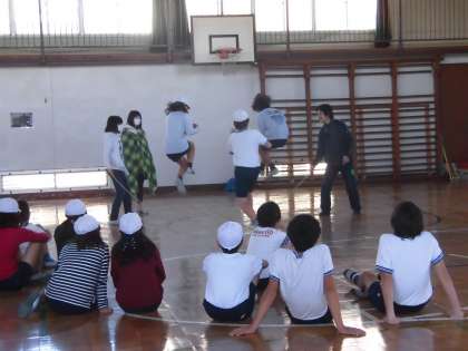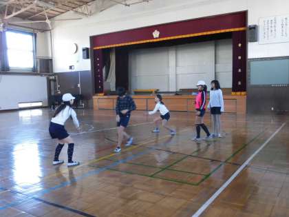 6年生の体育の様子です。今日の体育では、ながなわを使って難しい技に挑戦していました。グループごとに練習し、声を掛け合いながら取り組んでいました。技が成功した時は、思わず感嘆の声が上がります。