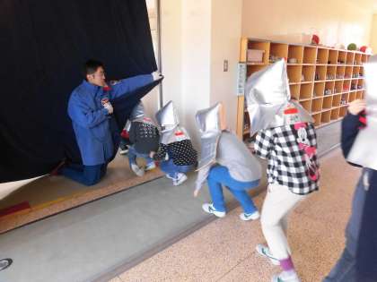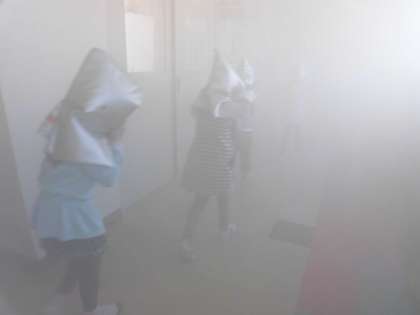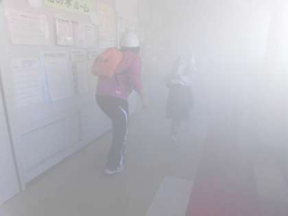 1月の避難訓練が雨により延期になったため、先週に引き続き、2月の避難訓練を行いました。今日は、給食室からの出火を想定し、東階段からの避難を練習しました。また、火災時に発生する煙から命を守るために、煙中訓練も行いました。世田谷区の防災課の皆様の協力で、学校の図書室前に「煙の中の避難経路」を作ってくださいました。白い煙で前が見えなくなりました。今日の避難訓練では、○ハンカチなどで鼻や口を覆う ○姿勢を低くする ○壁づたいに避難する この3つの大切なことを学習しました。