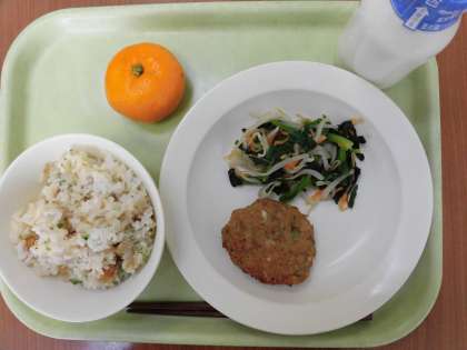 2月3日、節分の日にちなんで今日の給食は「いわしのつみれ焼き」「まめごはん」「おひたし」でした。節分の日には、厄払いをする風習があり、いわしを飾り豆まきをします。給食では、豆をご飯に入れ、いわしはハンバーグにしました。