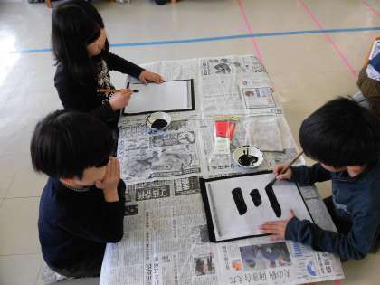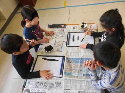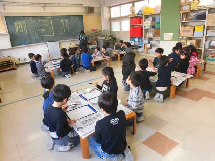 2年生の教科「日本語」の様子です。今日は、「筆を使って文字を書こう」の学習に取り組んでいました。「筆」とはどんなものかを知り、実際に筆を使って文字を書いてみました。子供たちは、墨のにおいをしっかり感じとりながら、正座をして少し緊張気味です。「上手に書けるかなあ。」「もっとやってみたいなあ。」など、筆で文字を書く日本の伝統的な活動に関心を高めながら、「三」「川」という文字を書きました。3年生から始まる毛筆の時間を楽しみにする子もたくさんいました。