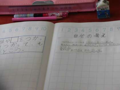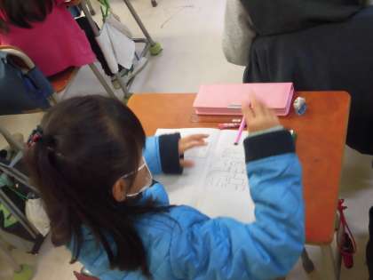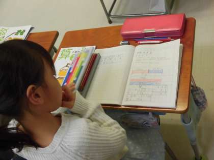 ノートに今日の学習のめあてを書いたら、自分の考えをノートにまとめる時間になりました。10分ほど、一人一人が文章問題をテープ図や□を用いて、自分なりの考え方で解いていきます。どの子も一生懸命にノートに考えをまとめています。色鉛筆を使ったり、図を書いたりと工夫もたくさんしています。