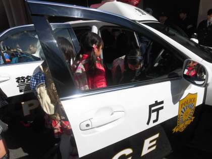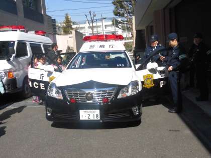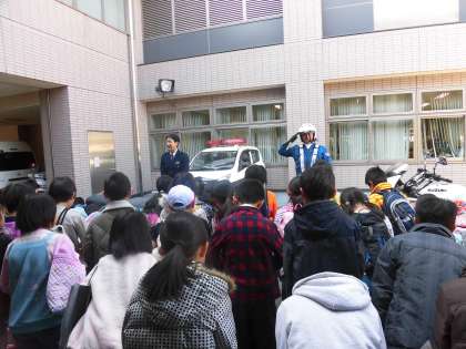 パトカーにも乗せていただきました。「ふつうの車との違いは何かな」「なんだかドキドキしてしまうな」と、いろいろな感想をもちながら、パトカー試乗をした子供たちの笑顔が輝いていました。おまわりさんの「警察官になりたいと思った人はいるかな」という問いかけに、たくさんの子が元気に「ハーイ」と手をあげました。将来が楽しみです。最後にしっかりお礼を伝えて見学の時間が終わりました。