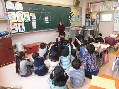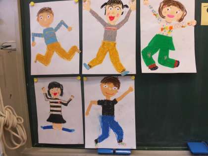 先生が「大切なお話をするので、前に集合します。」と子供たちに伝えると、1年生たちは、しっかり椅子を机にしまっています。先生の周りにぱっと集まり体育ずわりをしました。すばらしい態度です。写真は子供たちが作った作品です。今日、切り取った体のパーツから今度はどんな作品ができるか楽しみです。