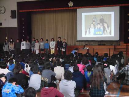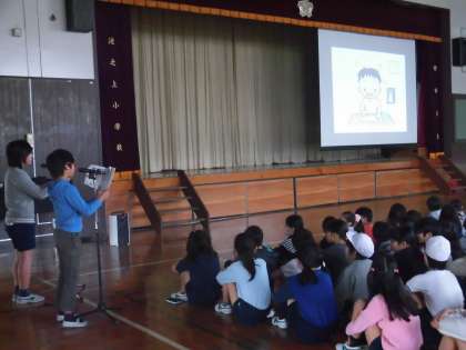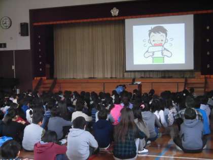2月25日、朝の集会の時間に保健・給食委員会から「睡眠の大切さ」についての発表がありました。大きな画面に映し出されたイラストに合わせて、委員会の子供たちがせりふを担当しました。登場人物になりきって上手に表現でき、練習の成果を十分に発揮していました。睡眠の仕組みや役割についてとても分かりやすく発表してくれたので、全校の子供たちみんな真剣に聞いていました。保健・給食委員会からのお話をしっかり受け止めて、睡眠の大切を理解し、早寝・早起きを実践してほしいです。