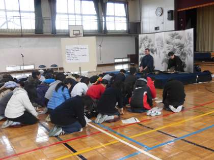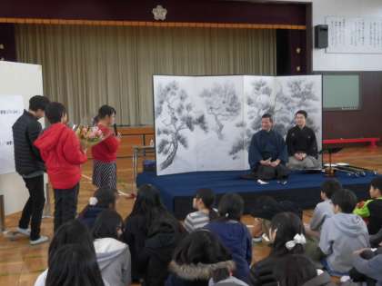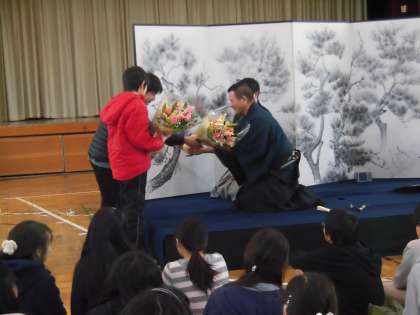 教えていただいた感謝の気持ちを表す「礼」を心こめて行いました。子供たちの背中から、「ありがとうございました」の心が伝わってきました。お礼の言葉も伝え、花束をお渡しして、すてきな三味線レクチャーコンサートは終わりました。