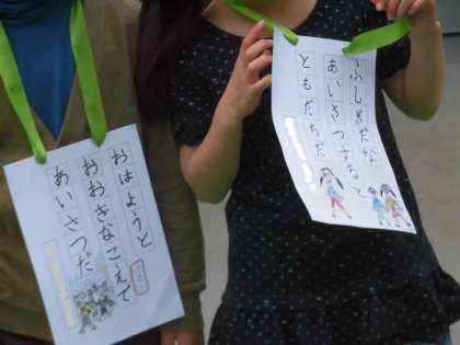 今日も1年生と代表委員の子供たちの「おはようございます」が響き渡りました。1年生のあいさつの標語がとてもすてきなので紹介します。