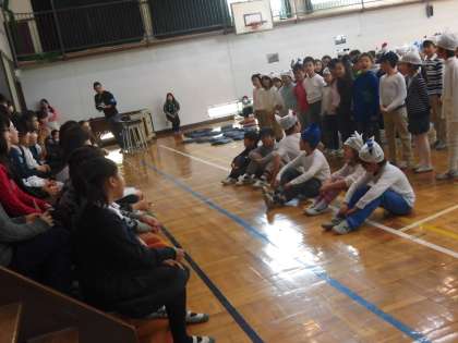2年生の出し物です。2年生は学芸会で演技した「ばうけんたいだニャン」をアレンジして、6年生への思いを伝えました。「6年生って何でもできるんだね。かっこいいし優しい」と伝え、元気に歌も歌いました。