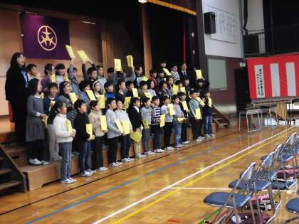 二分の一成人式が終了した後、緊張から解き放れた子供たちが元気いっぱいに集合写真を撮りました。