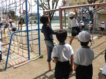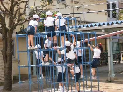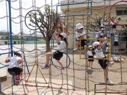 楽しそうに運動に取り組む1年生。学校には楽しい遊具もいっぱいです。これからたくさん友達と遊びながら、充実した学校生活を送ってほしいと願っています。