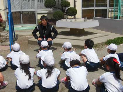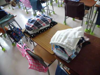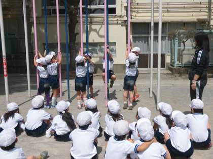 1年生が初めて体操着に着替えて校庭に出てきました。体育の授業を行っています。先生のお話もしっかり聞いています。教室をのぞくと、ていねいにたたまれた洋服が机の上に置いてありました。学習ルールを守って、授業に臨む1年生の子供たち。立派に学校生活を送っています。
