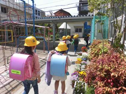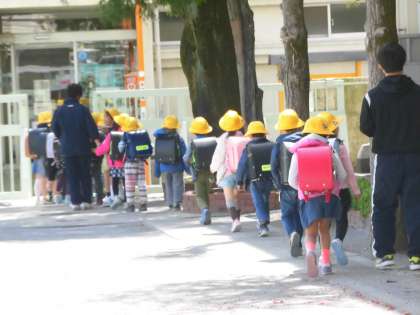 1年生は、今、集団下校を行っています。同じ方向に帰る友達と、交通ルールを確認しながら、担任や主事と一緒に下校します。もうしばらくこの集団下校を続け、安全に下校する習慣を定着させるとともに、安全への意識を高めていきます。
