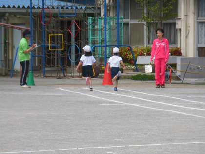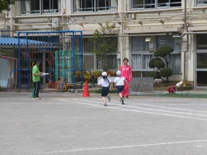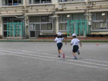 1年生が体育の時間に、1組・2組合同で直線を走る練習をしていました。みんな一生懸命走っていました。