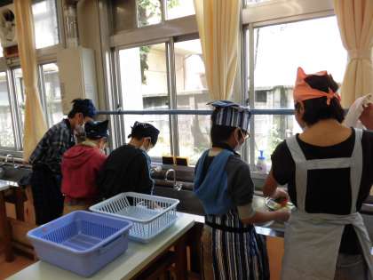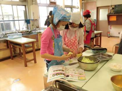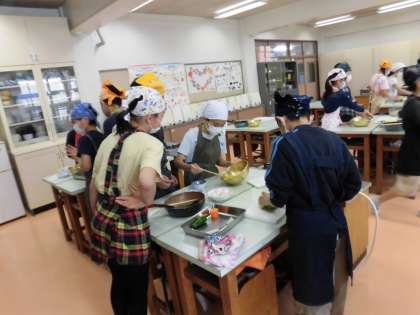 先生から卵の焼き方や野菜の切り方を教わった後は、グループごとに調理です。子供たちは少しぎこちなさや緊張している様子でしたが、みんなで確認し合いながら実習に臨んでいました。役割分担しながら、助け合っています。調理実習の学習でしたが、子供たちの協力し合う姿がとてもすてきでした。
