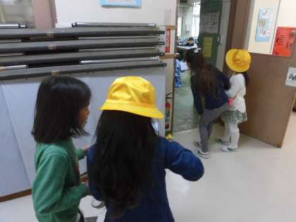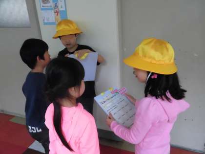 2年生が1年生に、やさしく学校を案内しています。2年生の「学校たんけん」のねらいは「下級生のお世話をすることで、自分の役割や行動の仕方について考え、安全で適切な行動ができる態度を育てる。」「1年生との関わりを通して、自分のよさや可能性に気付き、意欲と自信をもって学校生活を送ろうとする態度を育てる。」の二つです。2年生の姿を見ていると自分の役割を責任をもって果たそうとしていたり、一生懸命に1年生を案内する意欲的な様子が見られたりしていました。2年生のがんばりが光っていました。