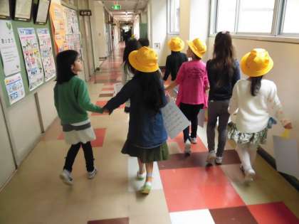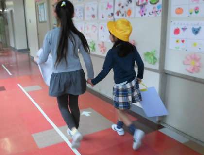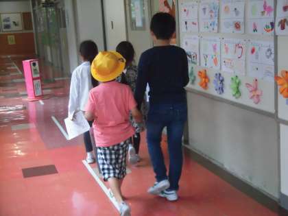 全体でのお話が終わると、いよいよ2年生が1年生を優しくリードして学校探検に出かけました。1年生は、学校のことをていねいに教えてくれる2年生に「ありがとう」と伝えていました。1年生の「学校たんけん」の活動のねらいは、「学校の様子を知ることで、学校生活への適応を図り、愛着をもたせる。」「楽しい学校生活を送ろうとする意欲や態度を育てる。」「学校や探検のきまりを守る態度を育てる。」の3つです。2年生と楽しく学校をまわりながら、きまりをしっかり守って行動できました。