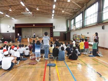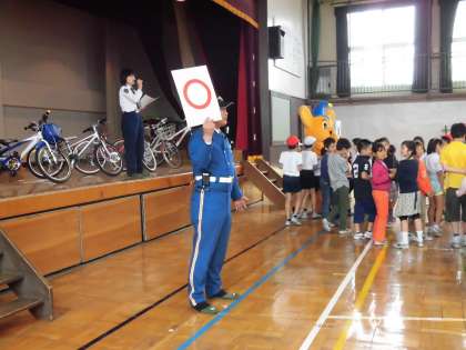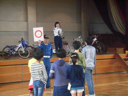 後半は○×ゲームを通して、自転車の乗り方やルールを楽しく学びました。クラス対抗ゲーム。みんなで大盛り上がりでした。自分たちのクラスや学年を応援する子供たち。熱が入った応援をしながら、自転車は「車」の仲間、「法律」(きまり)を守ることや、標識を見て従うことの大切を教えていただきました。