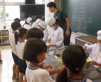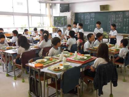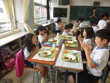 みんなで協力して給食の準備を行います。当番活動も学校の大切な学びの一つです。一人ではできないことも、協力することでがんばることができます。運動会の練習を一生懸命にがんばった子供たち、待ちに待った給食を楽しんでいました。