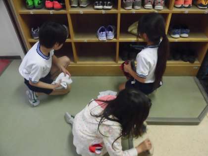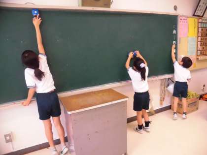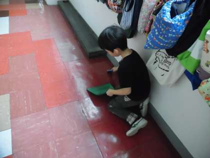 細かいところまで、ていねいにおそうじをする子供たち。池之上小学校の子供たちは「あ・そ・べ」です。そうじもしっかりがんばります。