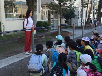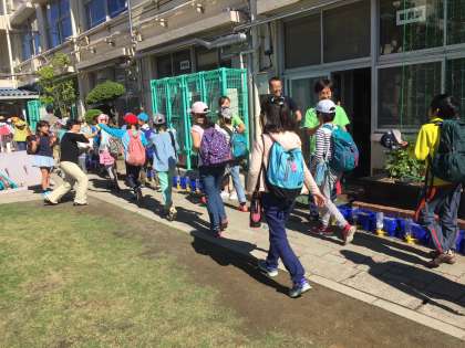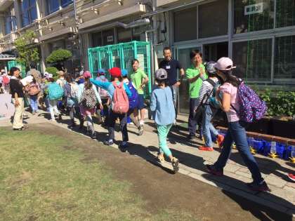 輝く青空、輝く新緑の中、高尾山に遠足です。みんなの行動がとても早かったため、先生から高尾山のお話を聞きました。みんな元気に出発しました。