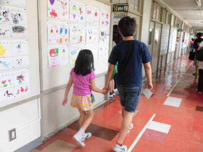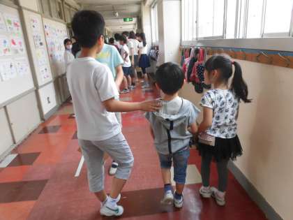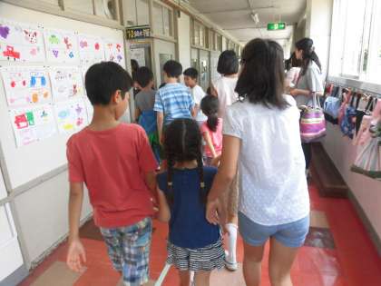 5月14日、第1回地区班活動が行われました。この活動は、子供たちと保護者の皆様、地域の皆様がお互いの「顔を知り合う」会です。地区班活動が行われる教室に、6年生が1年生を案内しました。やさしい6年生の様子が伝わってきました。