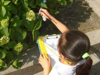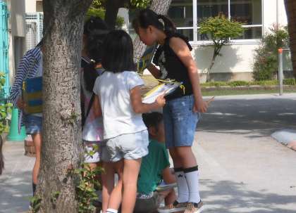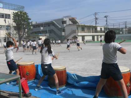 1日の最後の授業、6時間目の校庭の様子です。4年生が校庭の植物をスケッチしていました。大きさや花や葉の特徴をしっかりつかんで観察記録カードに記録しています。子供たちの観察力と表現力のすばらしさに感心しました。校庭の中央では、6年生が太鼓の音に合わせて、力強く表現活動をしていました。