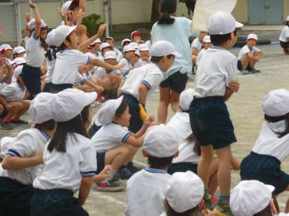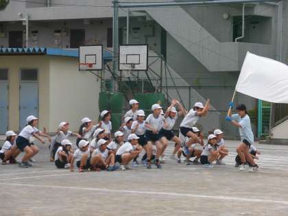 応援団と心を一つにして、ウェーブの練習をしました。1回の指示で、心を一つにすてきなウェーブができました。子供たちの力のすばらしさを感じました。