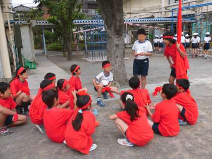 5月20日、運動会全体練習の2回目を行いました。全体練習終了後「赤組、応援団集まって!」という声が聞こえました。様子を見ていると、今日の応援の振り返りをしています。「声が出てきていい応援ができたけど、もっとがんばりましょう。土日のお休みも自分で練習してきて、また来週がんばりましょう。」と声を掛け合っていました。先生の指示でなく、自分たちの意思で集まったこの振り返りの場面。自分たちで考え行動する姿をうれしく見守りました。