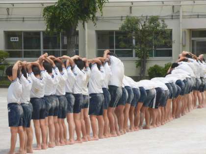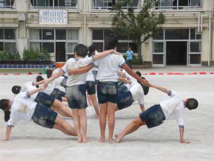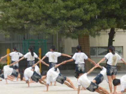 校庭で5・6年生が練習しています。今日は30度近く上がり、太陽の日差しがじりじりと差し込むよう感じます。そんな中、5・6年生の練習がありました。体操着についた砂からも子供たちのがんばりが伝わってきます。