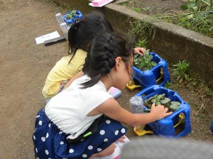 1年生が育てているアサガオ。大きく育っています。今日は、双葉と本葉の手ざわりも確認しました。そっと葉っぱに触ながら「つるつるしている葉っぱとざらざらしている葉っぱがあるね。」と自分たちの気づきを伝え合っていました。
