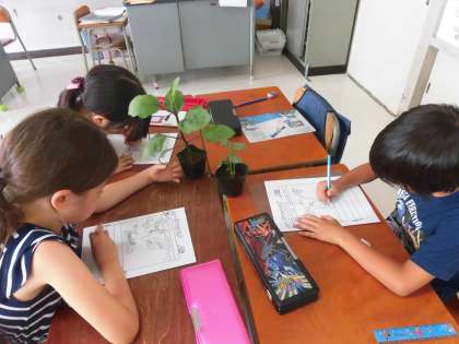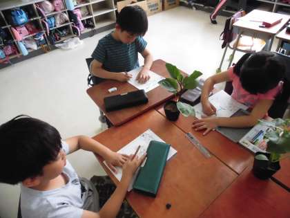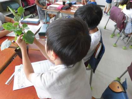 生活科の時間に2年生がキュウリとナスの観察を行っていました。グループで各1鉢の観察です。仲良く協力して和やかな雰囲気で授業が進められていました。子供たちの観察力はすばらしく、みんな上手に絵をかいています。手で触って葉っぱの感触を記録している子もいます。細かいひげや茎から出ている蜜のようなしずくもしっかり観察していました。