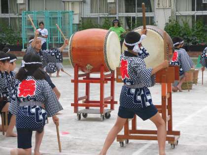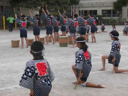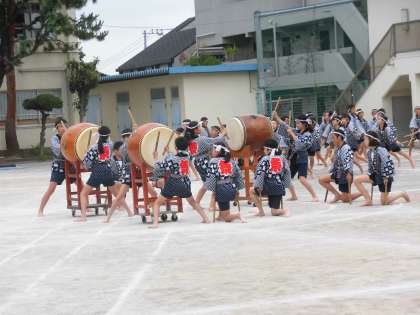 4年生の八木節は、6年生が太鼓で応援します。迫力ある太鼓の演技もみどころです。4年生と6年生が心ひとつにしてがんばっています。