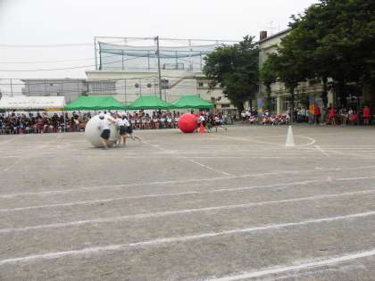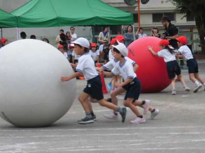 自分たちより体の大きい玉を4人で力を合わせて運びました。速く上手に運べるよう作戦も立てました。赤がリードしたかと思えば白が追い抜き、また赤が逆転と、大接戦。2回戦を行った結果、引き分け。お互いに拍手を送り合いました。