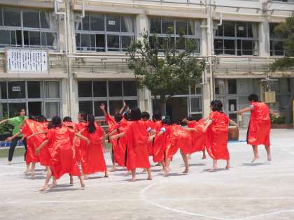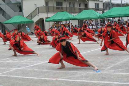 最初の2枚が練習時、最後の1枚が運動会で披露した表現です。腰を低く、指先まで意識しながら大きな動きを目標にしました。