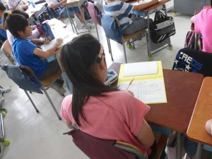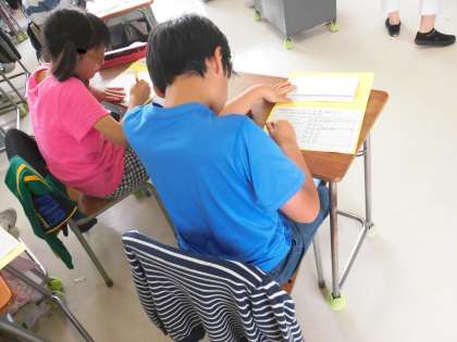 5年生の英語の授業の様子です。授業が終わりあいさつを英語で行うと、振り返りカードに今日の学習の自己評価と感想を書きました。英語の授業では毎時間、この自己評価活動を行っています。
