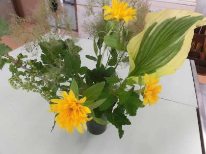 6月のお花はヒマワリ、フサスグリ、スモークツリー、ホスタです。スモークツリーはふさふさした花穂が煙のように見えることからつけられた名前だそうです。準備された花が子供たちの創作ですてきなアレンジメントになりました。大切に教室に持ち帰り飾られました。