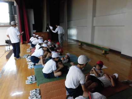 1・6年生のスポーツテスト、上体起こしの様子です。6年生が1年生の体をしっかり支えています。腹筋を使って1年生も一生懸命に上体を起こしています。