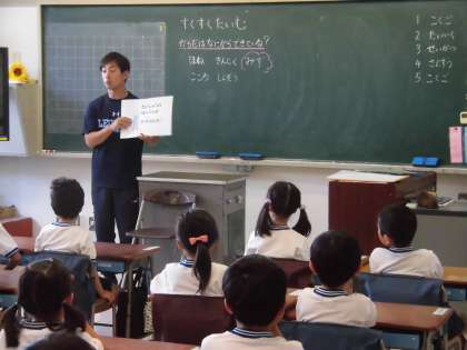 1年生の「すくすくタイム」は「じぶんのからだ」です。水分補給の大切などを学びました。これから暑くなります。自分たちで水分補給をしたり、体温調整をしたりすることの大切さも考えました。