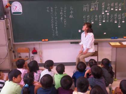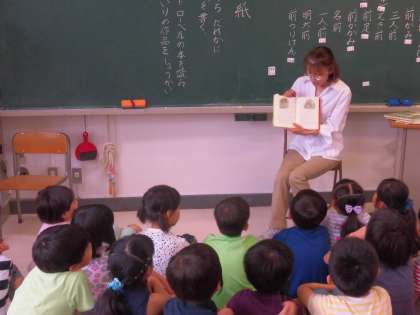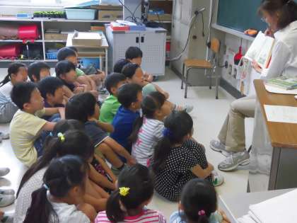 授業の終盤は先生の読み聞かせです。この「お手紙」の学習では単元を通した大きなねらいが二つありました。一つは「登場人物にお手紙を書く」、もう一つは「作者であるアーノルド・ローベルの本を何冊か読み、お気に入りの作品を紹介する」です。これからお気に入りの本の紹介活動に移っていきます。もうすでに子供たちはたくさんの本を読んでいるようです。今日は、先生のお気に入りのアーノルド・ローベルの作品紹介です。みんな真剣に、時には微笑みながら聞いていました。