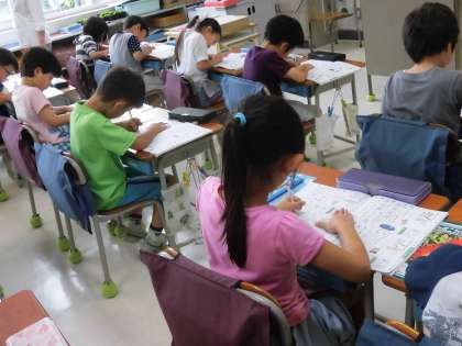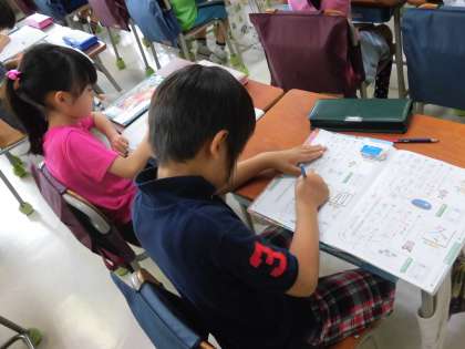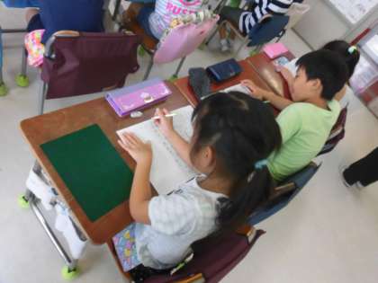 漢字練習帳にていねいに漢字を書き、練習しました。書き終わった子は自分のノートにみんなで集めた「前」の字のつく言葉をノートに書き写していました。たくさんの漢字をこうした学習過程で習得していきます。