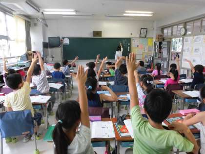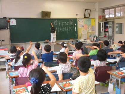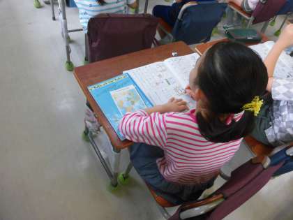 2年生の国語の授業の様子です。最初に「前」という漢字を勉強しました。「前」の漢字がつく言葉をみんなで発表し合うと、たくさんの言葉が黒板に並びました。書き順を意識して空書きもしました。その後は、先生の声に合わせて、書き順やはね・はらいなどを意識してていねいに書き進めました。みんなよくがんばっています。