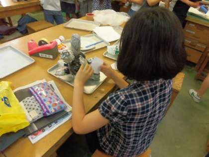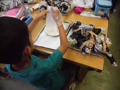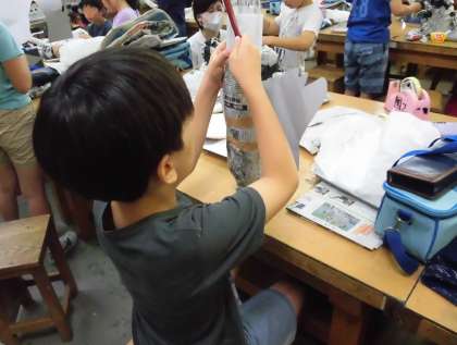 新聞紙で丸めたりしぼったりひねったりして、生き物の形を仕上げた子は、いよいよ和紙をのりではっていく作業です。最初はおそるそる取り組んでいた子も、こつをつかむと、しっかりとした張り子になるよう集中してがんばっていました。子供たちの作品ができあがるのを楽しみにしています。