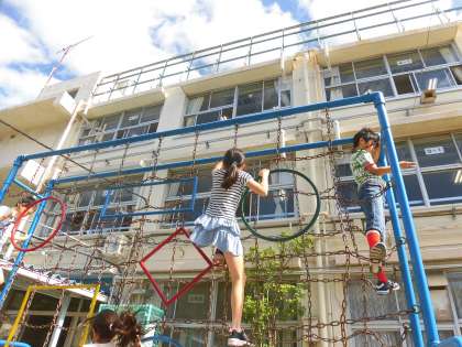 6月17日、学校公開の二日目。朝から青空が広がっています。子供たちのあいさつもひときわ大きく、笑顔が輝いているようにも見えます。お天気につられて、朝遊びにたくさんの子が校庭に出てきました。みんな元気に遊んでいます。