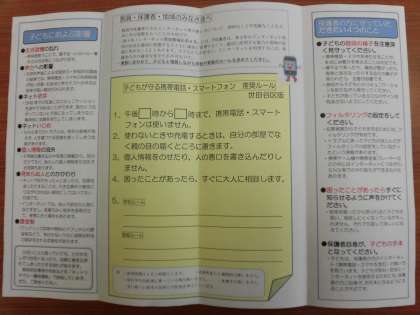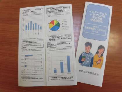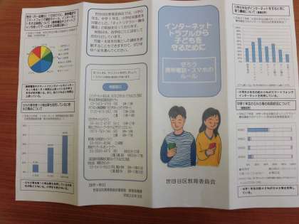 世田谷区では「インターネットトラブルから子どもを守るために〜守ろう 携帯電話・スマホのルール〜」というリーフレットを作成しました。学校でも代表委員会の子供たちが中心となって「学校ルール」を考えました。池之上小学校のルールは