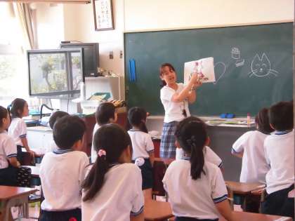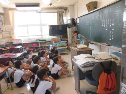 「ドレミの歌」を日本の歌詞と英語の歌詞で歌いました。英語は、日本語で説明するのではなく、先生の言葉とイラストを結び付けながら、自分たちで英語の意味を理解できるよう工夫しました。1年生は国際人としての基礎を学んでいましたが、一方、隣の2年生は、日本語の美しさを感じ取る教科「日本語」の学習をしていました。漢詩の暗誦も立派で、思わず拍手が起こりました。