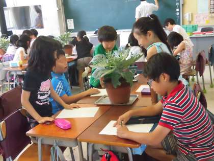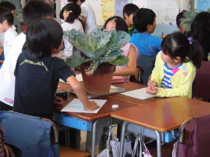 3年生はモンシロチョウの幼虫を観察しました。学級園で育てたキャベツを鉢に植え替え、モンシロチョウの卵や幼虫を育てています。今日はキャベツの葉を食べている幼虫の観察です。