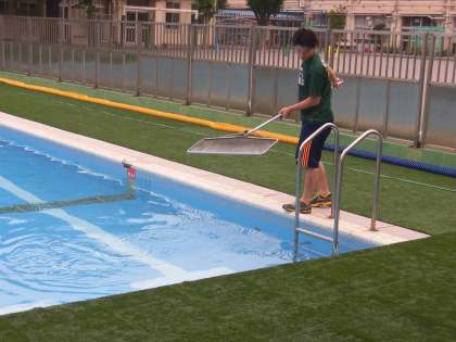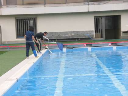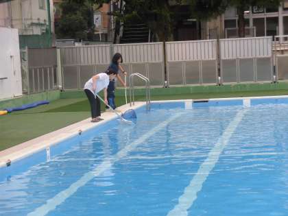 朝のプールの様子です。本日、プール開きを行う3・4年生がプールに入って楽しく運動できるようにと教員がプールの状況確認と水温・気温を測っています。今年度初めての水泳指導ということもあり、プールへのお清めも行いました。この夏、安全第一に、子供たちが楽しく水泳に取り組み、それぞれの力を伸ばしていくことを願って水泳指導に取り組みたいと思います。