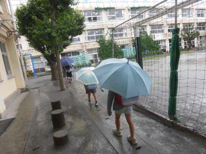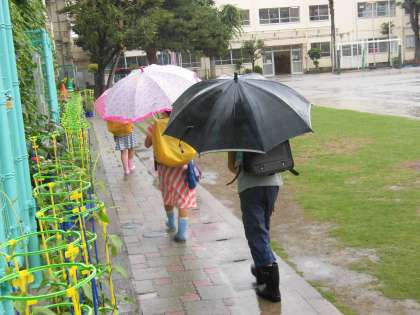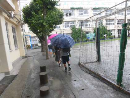 今日もまた、雨の朝を迎えました。子供たちは傘をさして登校。しっかり歩いています。